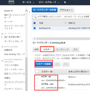 リスナーでは「HTTP」の80番ポートと「リスナーの追加」で「HTTPS」の443番ポートをあける